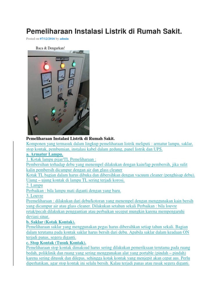 Artikel sop perawatan instalasi listrik komponen instalasi listrik : Sop pemantauan, pemeliharaan, perbaikan sarana dan peralatan.docx: Daya dan panel kontrol adalah: Pengertian perawatan instalasi listrik terdiri dari perawatan rutin dan perbaikan/rehab. Prosedur untuk memperoleh bahan yang dibutuhkan dalam perbaikan panel listrik dan switchgear.